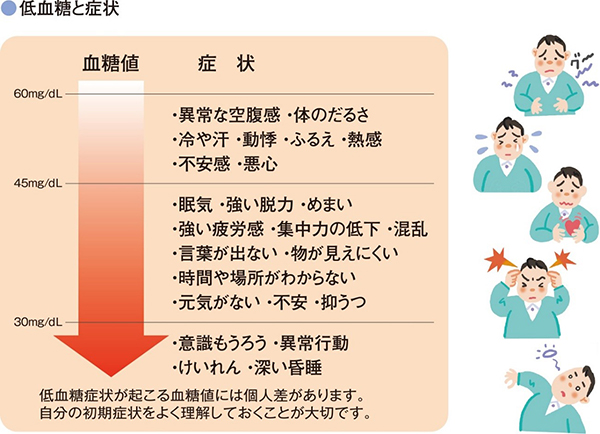 注射薬の中でも、特にインスリンを使用している方、GLP-1受容体作動薬でも低血糖になりやすい内服薬を一緒に飲んでいる方は、低血糖の症状やいざという時の対処方法を知っておきましょう。こちらもいつでもご相談ください。