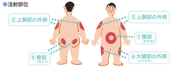 後述するGLP-1製剤もそうですが、皮下(皮膚のすぐ下です)に注射します。部位はお腹、上腕の外側、おしり、太ももなどです。吸収の速さは、お腹→上腕外側→おしり→太ももの順番です。いつも同じ場所に注射すると皮膚がへこんだり、ふくれたりすることがあります。硬くなるとインスリンの注入がうまくいきません。毎回2-3cmずらして注射しましょう。