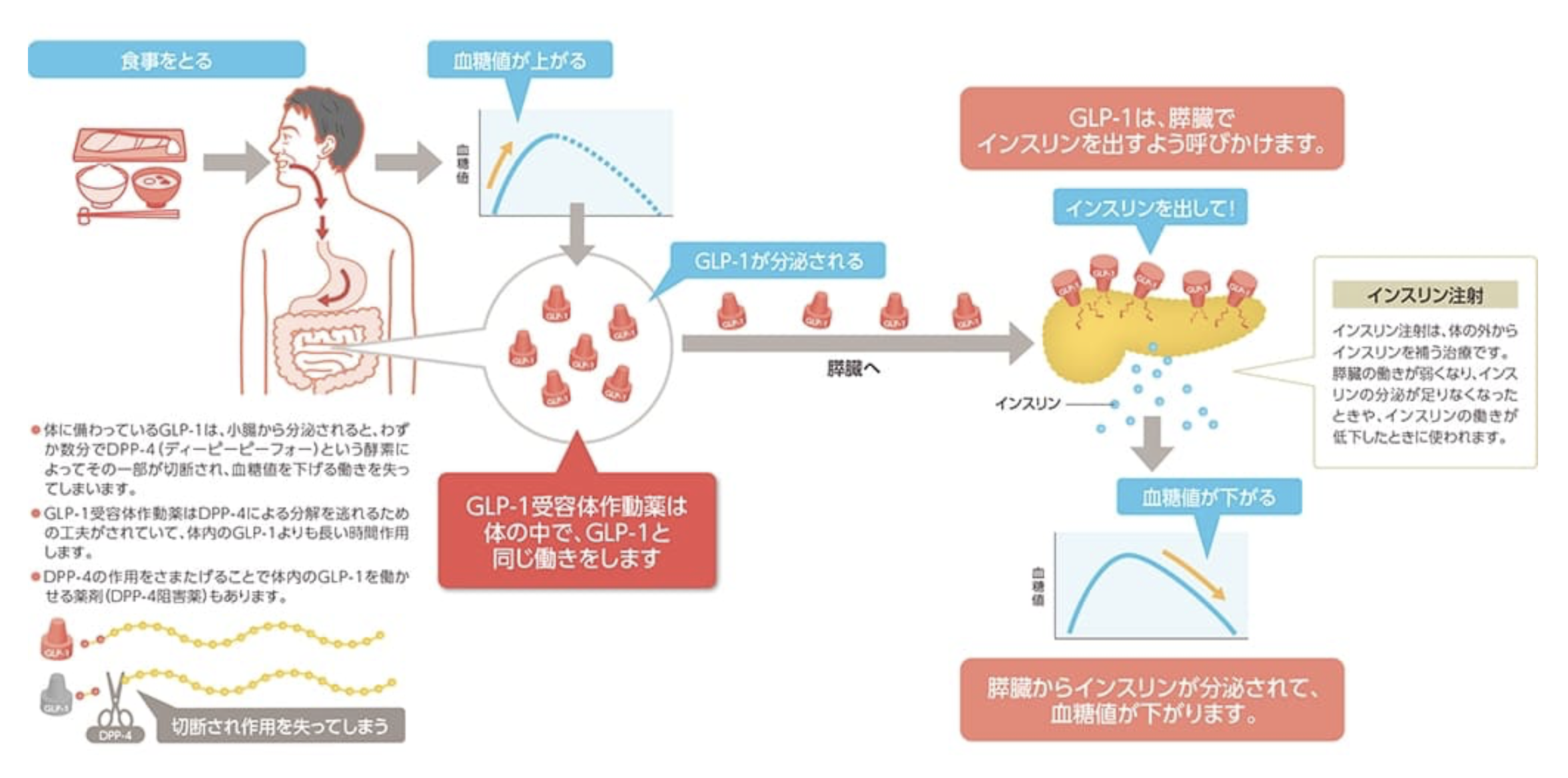イラスト出典:知りたい!糖尿病インスリン注射以外にも血糖値を下げる注射剤があります。GLP-1受容体作動薬という薬です。一般名(商品名) リラグルチド(ビクトーザ) エキセナチド(バイエッタ) リキシセナチド(リキスミア)がございます。